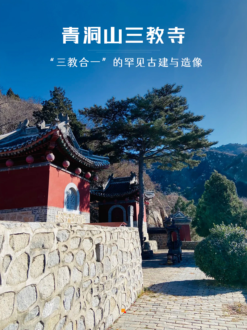 三教寺坐北朝南,东北靠山崖,西南为陡坡。寺后有一山洞为“卧佛寺”,洞口朝南,口宽4米,洞深6.2米。洞内东西北壁砌有石墙,西高东底。西墙有壁画痕迹另有一壁龛,顶部岩石上绘有彩色云图,以红兰色为主。正北有一佛龛,据说早年泥塑卧佛卧于佛龛之上。夜晚的月光和拂晓的朝霞映在石佛上,洞内通明,色彩瑰丽,青洞山也因这个岩洞而得名。